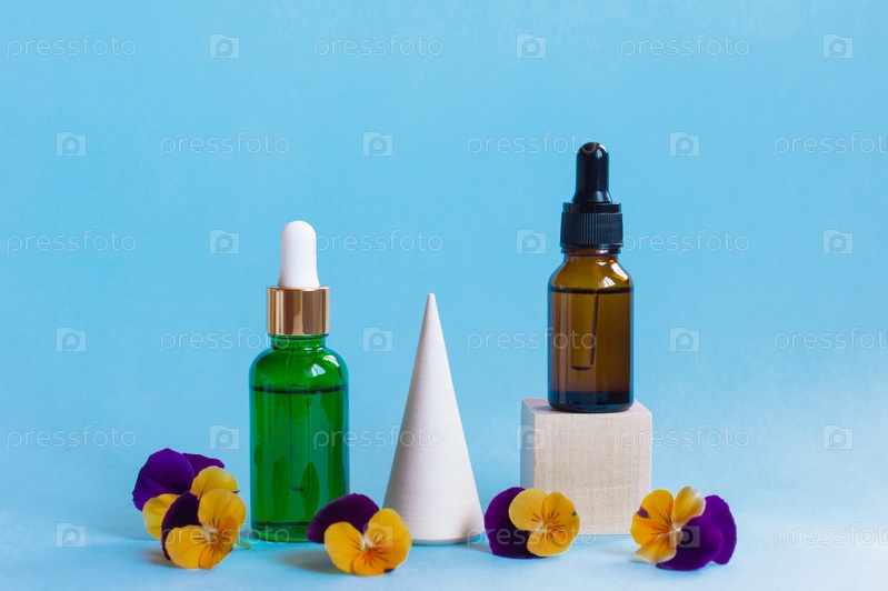 Стеклянные бутылки сыворотки с пипеткой и красивыми цветами альта на синем фоне. Натуральная органическая спа-косметика. Передний план