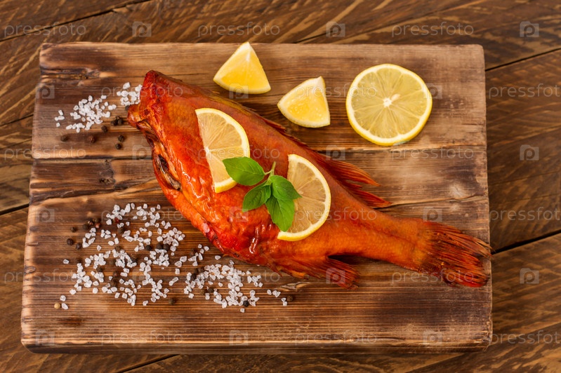 Вкусный копченый морской окунь на деревянной разделочной доске для здоровой пищи, диеты или кулинарной концепции, избирательный фокус
