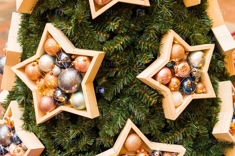Новогодняя или новогодняя елка оформляется в современном стиле. большие деревянные ящики в форме звезд наполнены разноцветными шарами