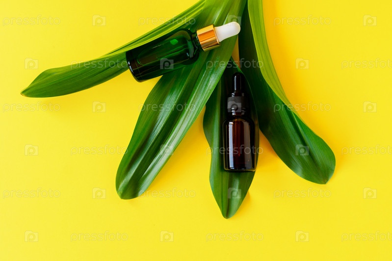 Бутылка сыворотки на зеленом листе. Модный косметический продукт для молодой кожи. Дополнительный этап увлажнения в ежедневном уходе за лицом