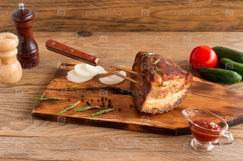 Домашнее копченое барбекю из говяжьей грудинки на деревянной разделочной доске перед нарезкой