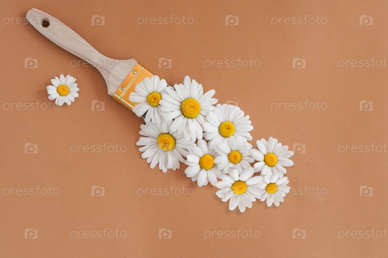 Рисунок кистью с цветами ромашки на коричневом фоне. Концепция весны и международного женского дня 8 марта