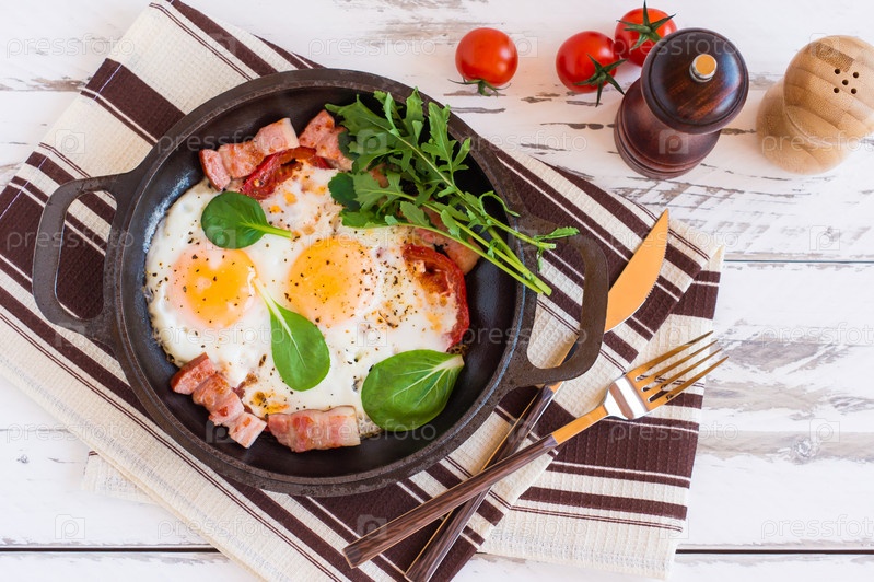 Английский завтрак или обед с жареным яйцом, шпинатом, рукколой, помидорами и беконом на черной сковороде