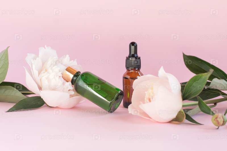 Роскошные косметические флаконы с антивозрастным средством по уходу за кожей на фоне цветов пиона, упаковка с пустой этикеткой для брендинга ухода за телом