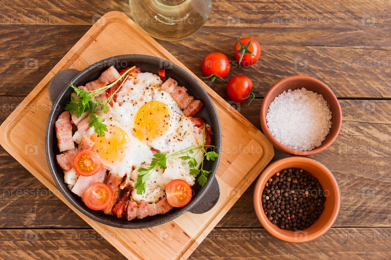 Домашняя яичница с беконом и помидорами в сковороде на деревянном фоне. Классический завтрак. Вид сверху