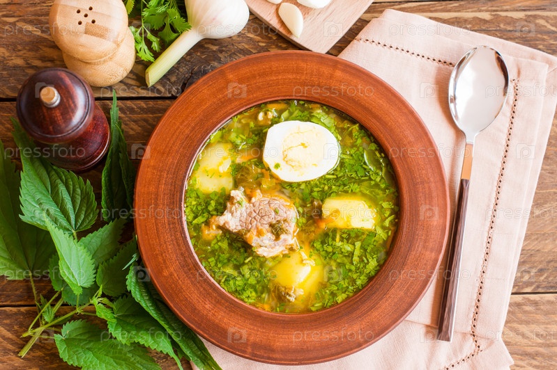 Большая тарелка зеленого супа из свежего щавеля и крапивы с куриным яйцом в мясном бульоне. вид сверху. деревянный стол. деревенский стиль