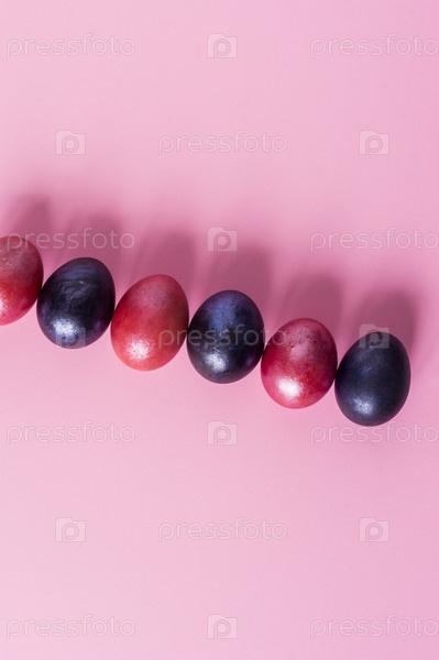 Мини-композиция к празднику Пасхи. разноцветные крашеные яйца чуть на розовом фоне. вид сверху