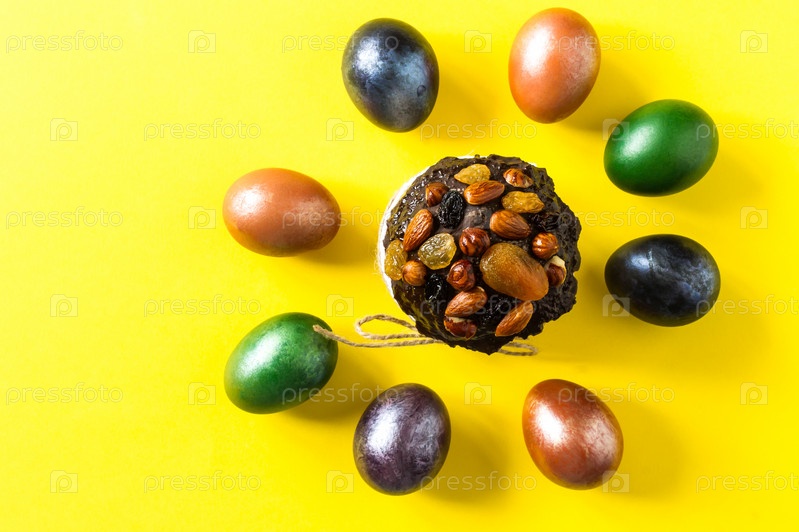 Кулич с орехами и сухофруктами на желтом фоне с разноцветными крашеными яйцами. концепция праздника Пасхи. вид сверху
