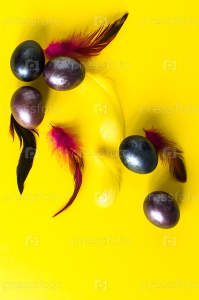 Творческая пасхальная композиция. фиолетовые яйца и перья на желтом фоне. вид сверху. плоская планировка