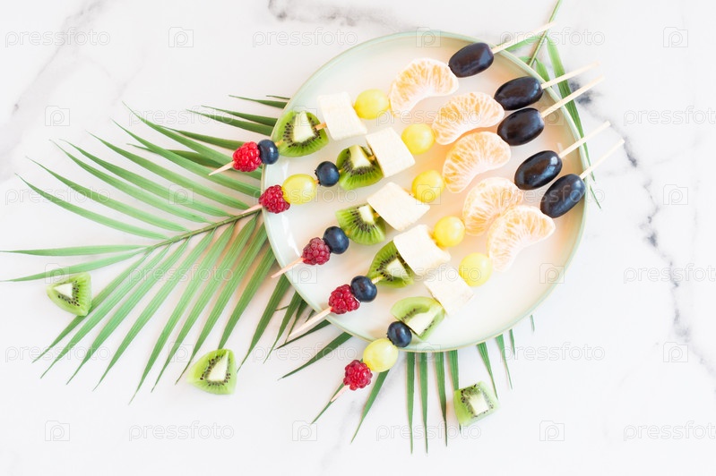Канапе из свежих фруктов и ягод на тарелке. Мраморный фон с пальмовой ветвью. Праздничная еда