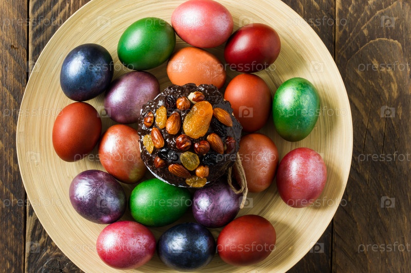 Большая деревянная тарелка с куличом и яйцами с цветами на деревенском деревянном столе. вид сверху. близкий угол