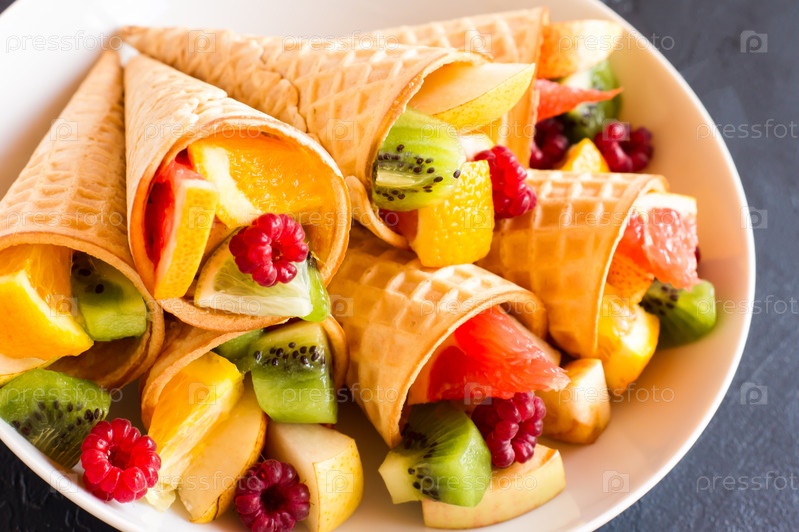 Сочные спелые фрукты в вафельных рожках на белой тарелке. близкий угол