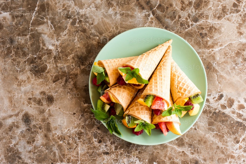 Вафельные рожки с летними фруктами на тарелке. мраморный фон. концепция сладкого меню