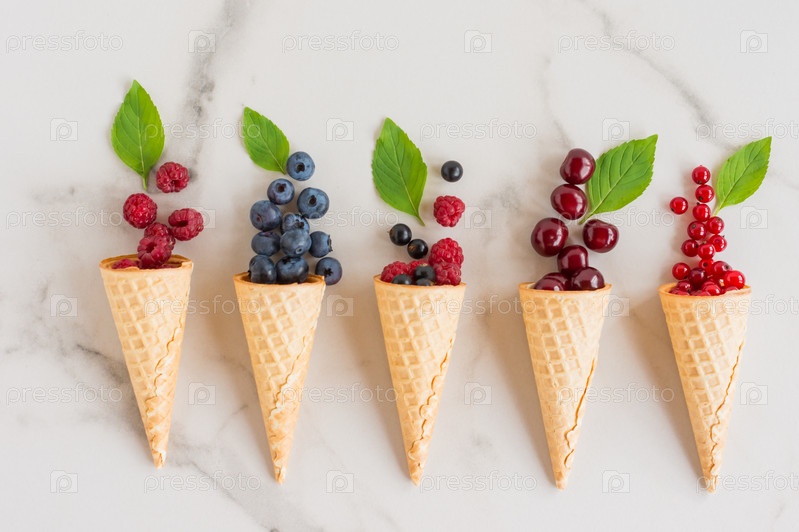Вафельные рожки с ягодами и листьями мяты на столе из белого мрамора. вкусный десерт. вид сверху