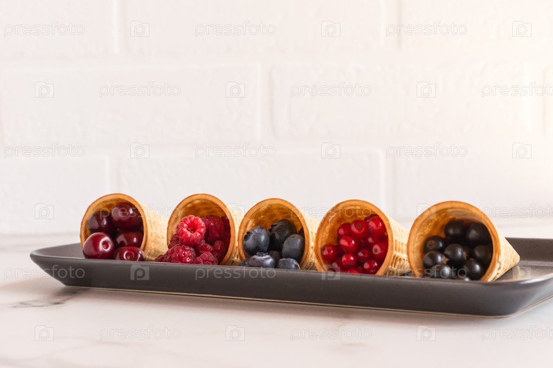 Вкусный здоровый завтрак из спелых ягод в вафельных рожках. диетический продукт. здоровое питание