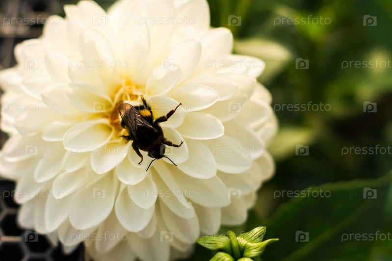 Крупный план цветущего белого нежного георгина со шмелем в центре цветка