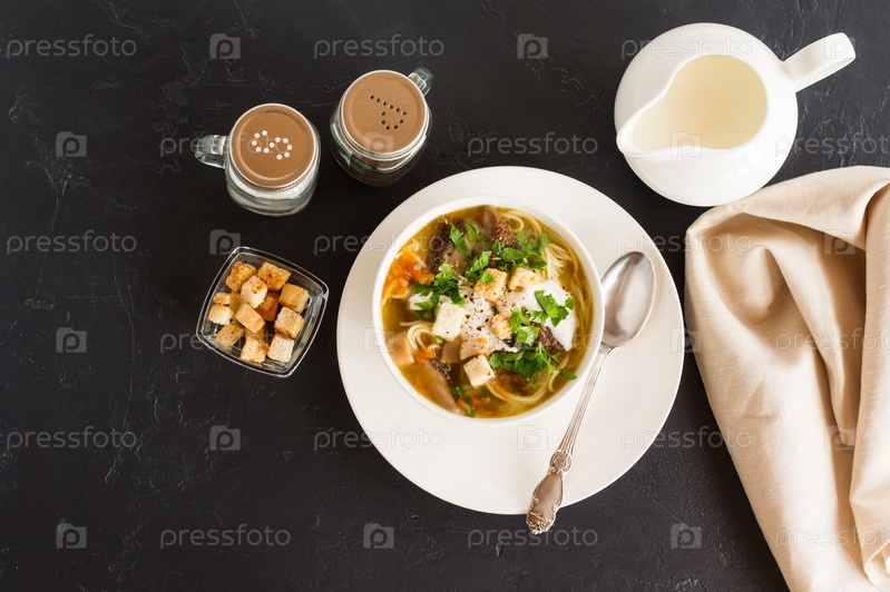 Сезонный летний суп из лесных грибов со сливками, зеленью и гренками. вкусный обед. черный фон. вид сверху