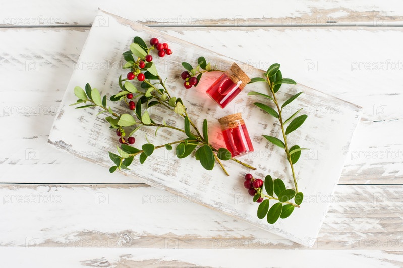 Эфирное масло клюквы в стеклянных бутылках с пробковой крышкой на белой деревянной подставке с ветвями натуральной клюквы