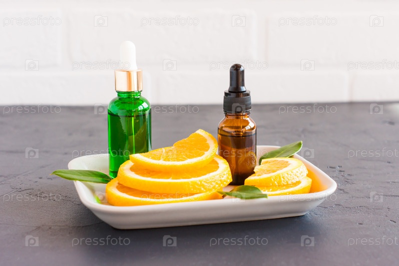 Сыворотка для лица в стеклянных бутылках с пипеткой, дольками апельсина, зелеными листьями. натуральные органические средства по уходу за собой