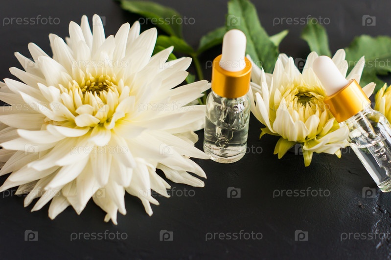 Геалуроновая кислота в косметических флаконах на фоне белого георгина. интенсивное увлажнение, питание и сохранение молодости кожи