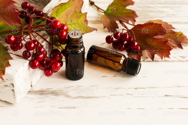 Композиция с бутылочками натурального эфирного масла из ягод калины и деревянной коробкой с красными ягодами. натуральная медицина и косметика