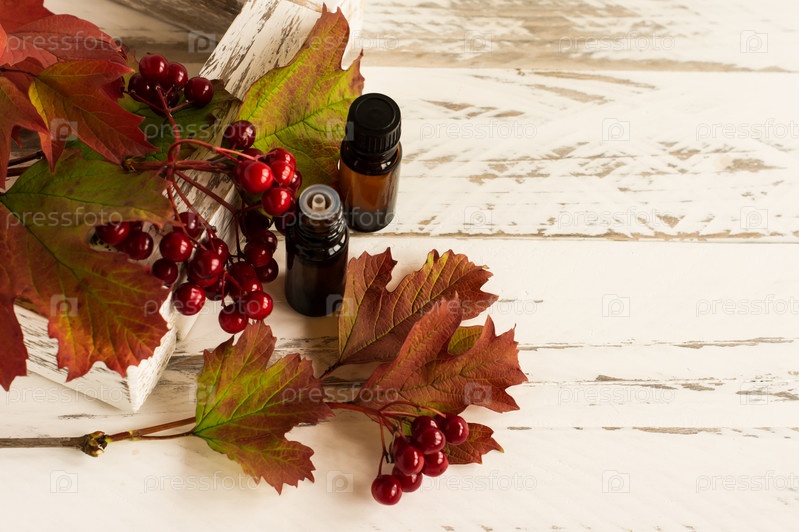 Натуральное эфирное масло из семян калины в стеклянных бутылках на белом деревянном фоне. естественная концепция заботы о себе