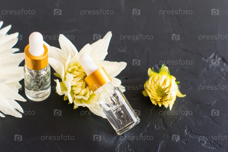 Две стеклянные бутылки капельниц для медицинского и косметического применения на черном фоне с белыми цветами
