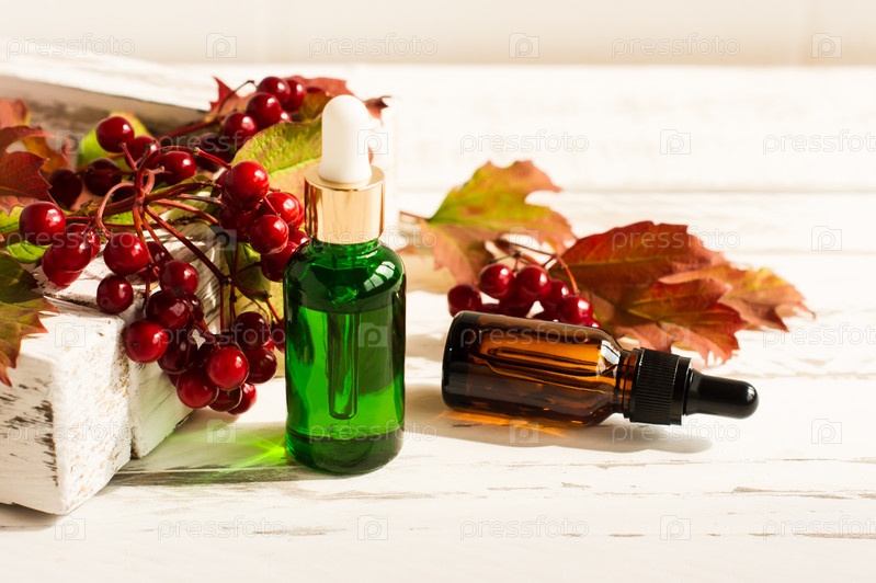 Косметические флаконы с омолаживающим средством по уходу за кожей на фоне белой коробки с веткой калины и спелыми ягодами