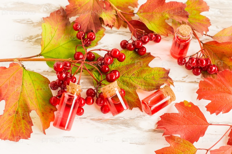 Вид сверху на осеннюю композицию из бутылок с натуральным маслом калины и веток со спелыми ягодами калины