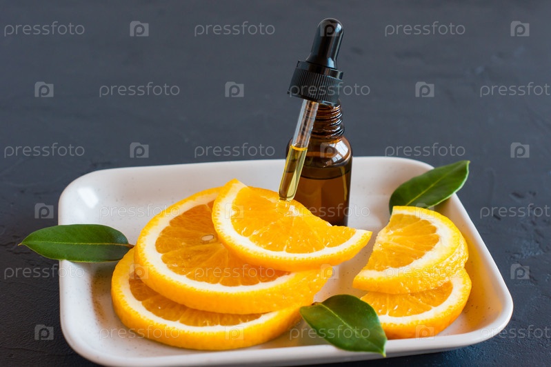 Косметическая бутылка с пипеткой и сочными апельсиновыми дольками на керамическом белом подносе. увлажнение, ароматерапия, антистрессовый эффект