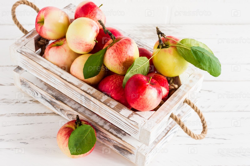 Сочные спелые яблоки в коробке на белом деревянном столе