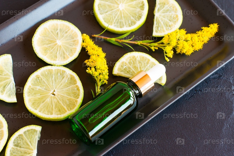 Косметический продукт для ухода за кожей лица в бутылке с пипеткой на фоне керамической тарелки с ломтиками лимона