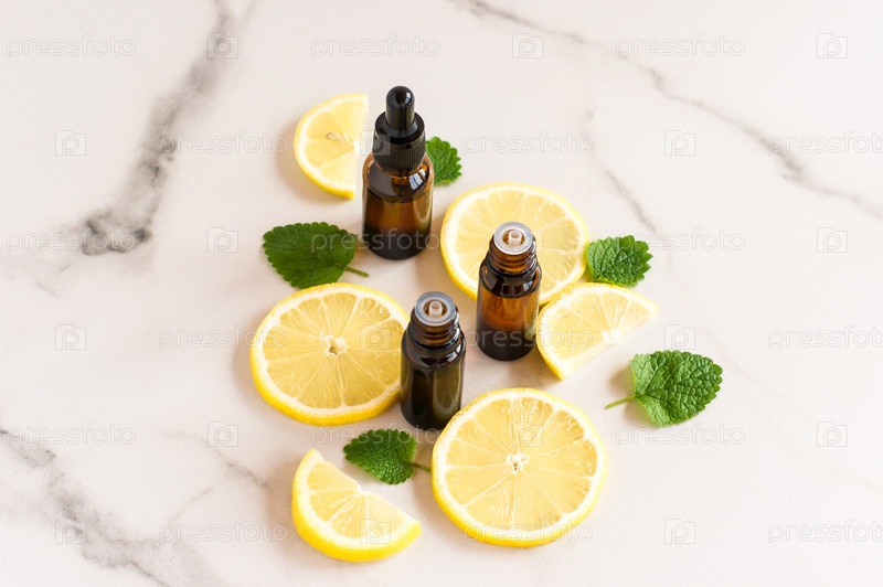 Косметические флаконы из темного стекла с эфирными маслами листьев лимона и мелиссы на мраморном столе