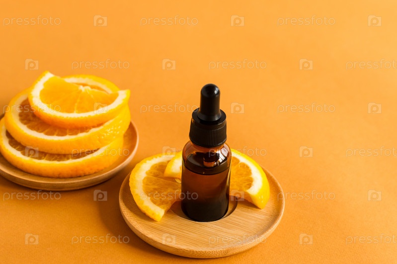 Сыворотка с витамином С, бутылка эфирного масла апельсина и ломтики свежих фруктов на оранжевом фоне