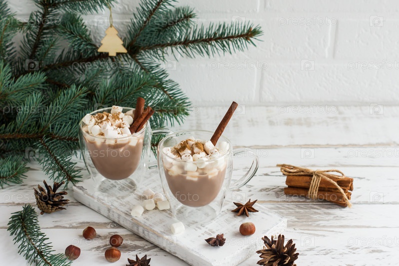 Шоколадный напиток или горячее какао с зефиром в современной стеклянной кружке с двойным дном. концепция уютных новогодних и рождественских праздников