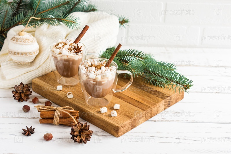 Традиционный новогодний напиток с зефиром на деревянной доске на фоне белой кирпичной стены, еловых веток и елочных игрушек