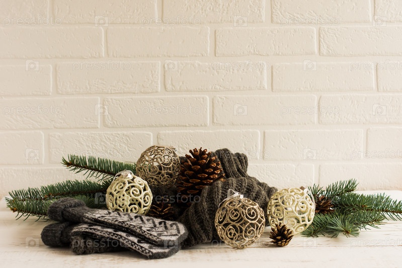 Новогодняя композиция на фоне белой кирпичной стены. вязаные варежки и шарф, оригинальные елочные шары, ветки и большая шишка