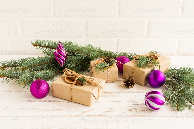 Новогодняя или рождественская композиция из еловых веток с праздничными шарами и коробочками поделок, украшенная корицей и дольками сухого апельсина