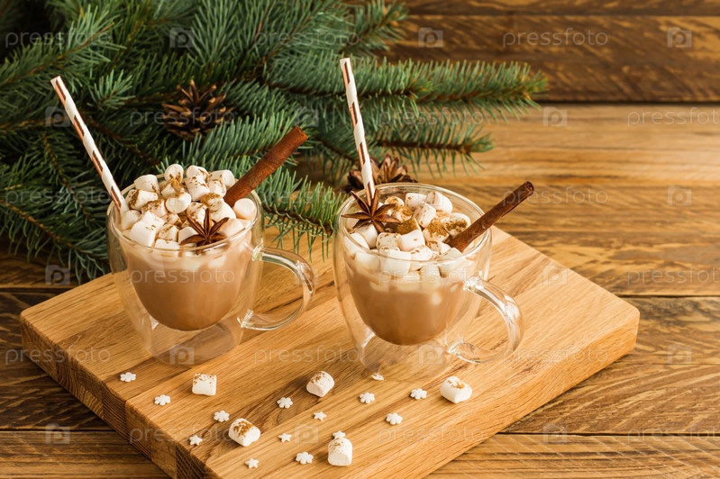 Шоколадный напиток или горячий шоколад с зефиром в стеклянных трещинах на деревянной доске на фоне зеленой ветки ели