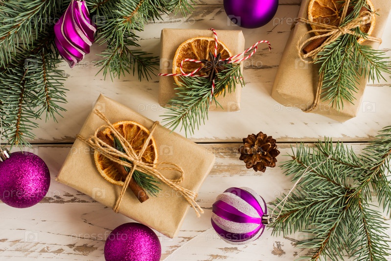 Новогодний или рождественский фон. подарочные коробки ручной работы с дольками апельсина и корицей, перевязанные шпагатом. белый деревянный фон. вид сверху