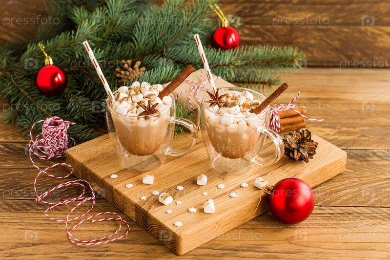 Новогодняя композиция из двух кружек с горячим какао и зефиром на деревянном фоне с еловой веткой и красными шариками