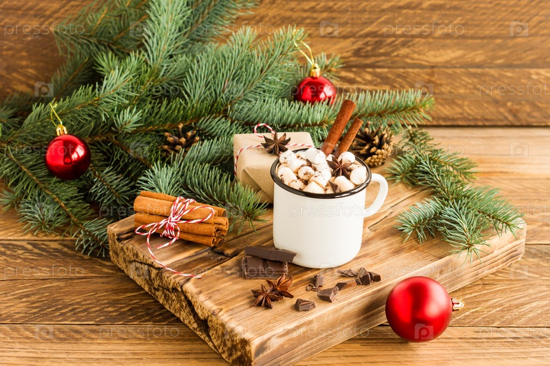 Белая эмалированная кружка с горячим шоколадом или какао, кусочками шоколада и палочками корицы на деревянной доске. концепция уютного Рождества