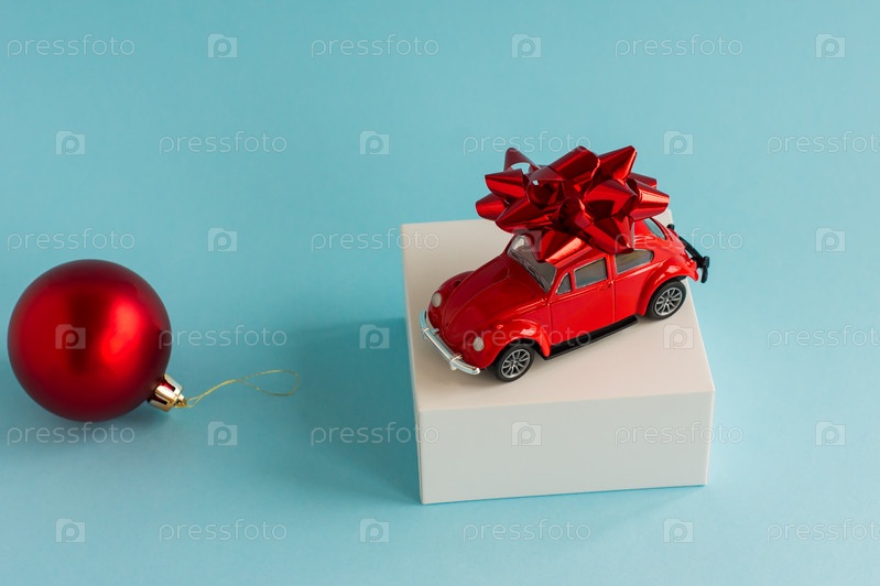 Миниатюрная модель ретро-автомобиля красного цвета на белом пуйле с праздничным бантом. Синий новогодний фон с красным шаром