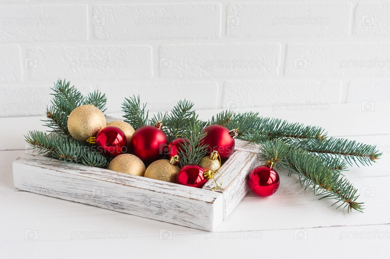 Декоративная белая коробка из дерева с праздничными елочными шарами на белом деревянном столе на белой кирпичной стене и еловыми ветками
