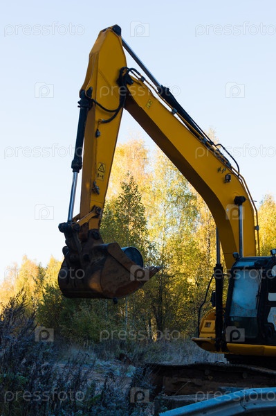 Желтый гусеничный экскаватор стоит в ожидании раскопок на дороге возле осеннего леса рано утром