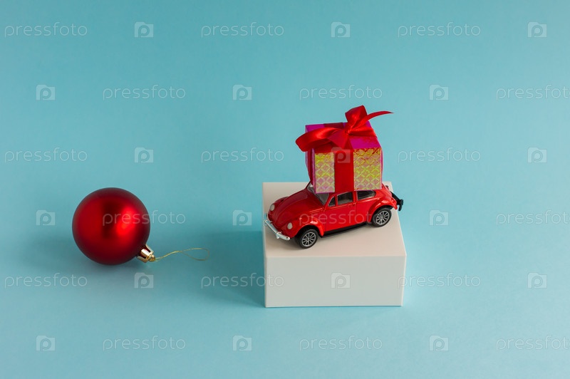 Красная игрушечная машинка с новогодним подарком на крыше на белом пуле и синем фоне. концепция новогодних скидок и распродаж