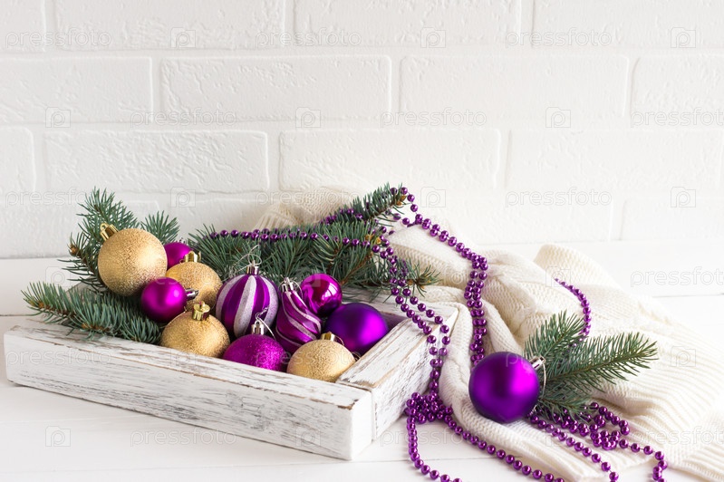 Рождественская композиция из ярких елочных игрушек и бу на фоне вязаного белого свитера. концепция уютного Рождества