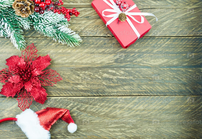 Рождественский деревянный фон с еловой веткой и ягодами, красная коробка с подарком, новогодняя шапка. копия пространства
