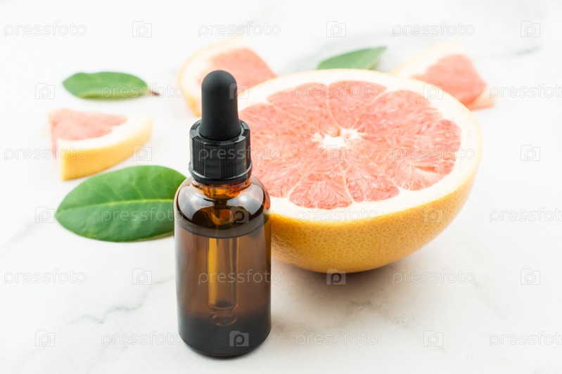 Бутылка натурального масла грейпфрута на белом столе с фруктами грейпфрута. концепция ухода за лицом. профилактика возрастных изменений кожи