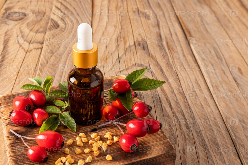 Косметический флакон с капельницей из темного стекла с органическим продуктом на основе масла семян шиповника. натуральная косметика. презентация продукта